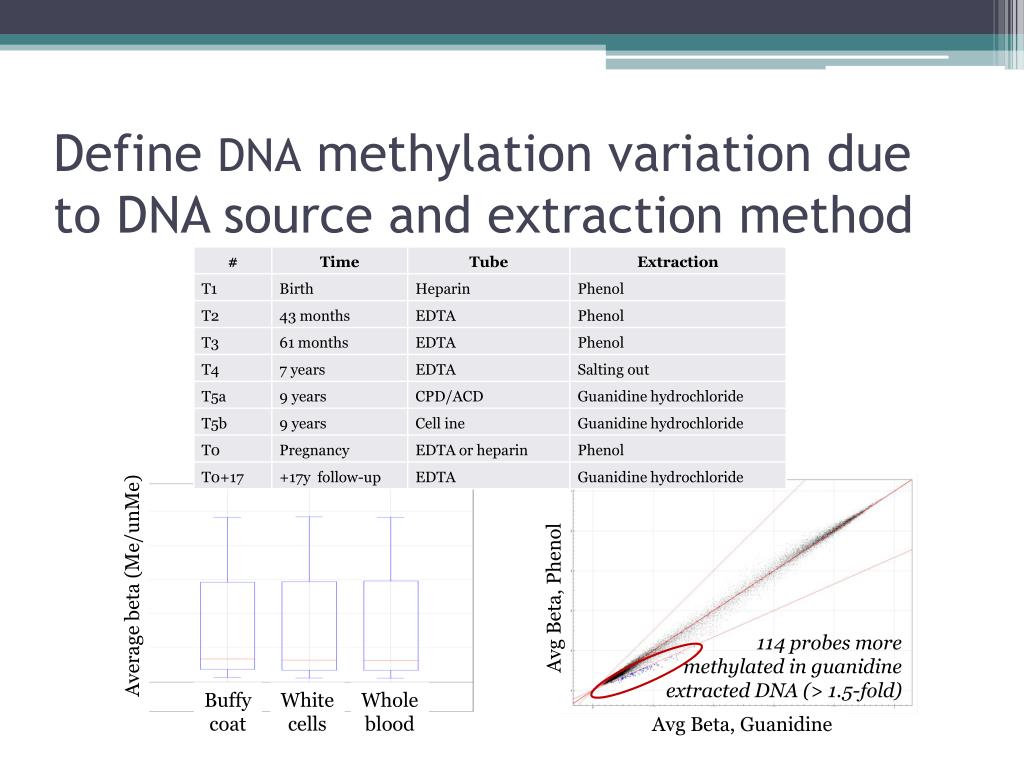 Define DNA methylation variation due to DNA source and extraction method Average beta (Me/unMe) Avg Beta, Phenol 114 probes more methylated in guanidine extracted DNA (> 1.5-fold) Buffy coat White cells Whole blood Avg Beta, Guanidine