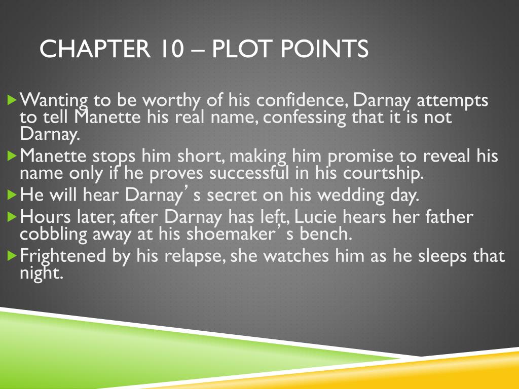 Chapter 10 – Plot Points • Wanting to be worthy of his confidence, Darnay attempts to tell Manette his real name, confessing that it is not Darnay. • Manette stops him short, making him promise to reveal his name only if he proves successful in his courtship. • He will hear Darnay’s secret on his wedding day. • Hours later, after Darnay has left, Lucie hears her father cobbling away at his shoemaker’s bench. • Frightened by his relapse, she watches him as he sleeps that night.