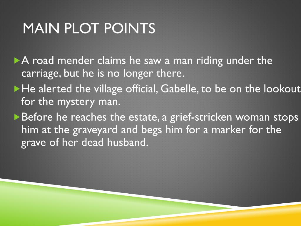 Main Plot Points • A road mender claims he saw a man riding under the carriage, but he is no longer there. • He alerted the village official, Gabelle, to be on the lookout for the mystery man. • Before he reaches the estate, a grief-stricken woman stops him at the graveyard and begs him for a marker for the grave of her dead husband.