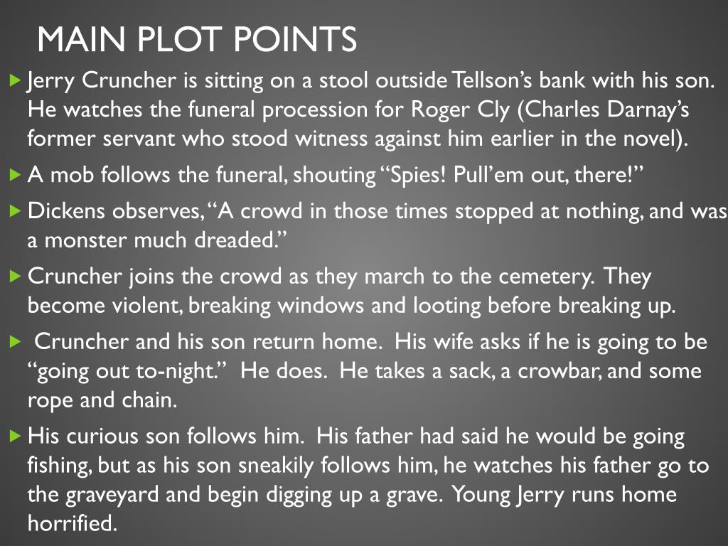 Main plot points • Jerry Cruncher is sitting on a stool outside Tellson’s bank with his son. He watches the funeral procession for Roger Cly(Charles Darnay’s former servant who stood witness against him earlier in the novel). • A mob follows the funeral, shouting “Spies! Pull’em out, there!” • Dickens observes, “A crowd in those times stopped at nothing, and was a monster much dreaded.” • Cruncher joins the crowd as they march to the cemetery. They become violent, breaking windows and looting before breaking up. • Cruncher and his son return home. His wife asks if he is going to be “going out to-night.” He does. He takes a sack, a crowbar, and some rope and chain. • His curious son follows him. His father had said he would be going fishing, but as his son sneakily follows him, he watches his father go to the graveyard and begin digging up a grave. Young Jerry runs home horrified.