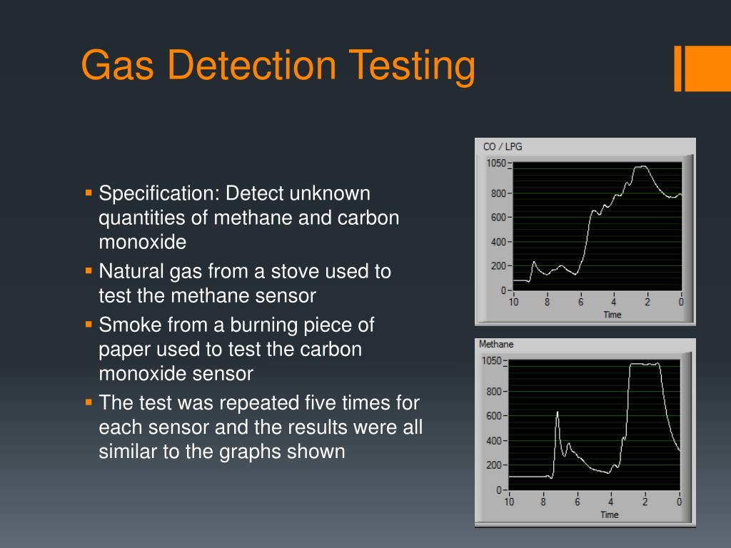 Gas Detection Testing • Specification: Detect unknown quantities of methane and carbon monoxide • Natural gas from a stove used to test the methane sensor • Smoke from a burning piece of paper used to test the carbon monoxide sensor • The test was repeated five times for each sensor and the results were all similar to the graphs shown