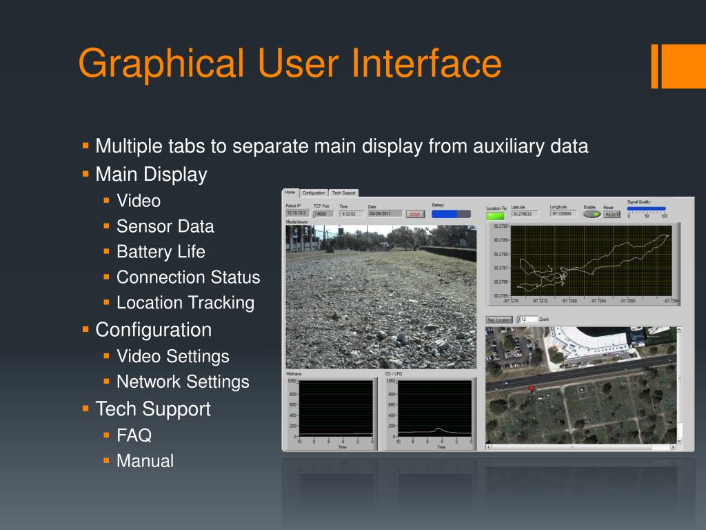 Graphical User Interface • Multiple tabs to separate main display from auxiliary data • Main Display • Video • Sensor Data • Battery Life • Connection Status • Location Tracking • Configuration • Video Settings • Network Settings • Tech Support • FAQ • Manual