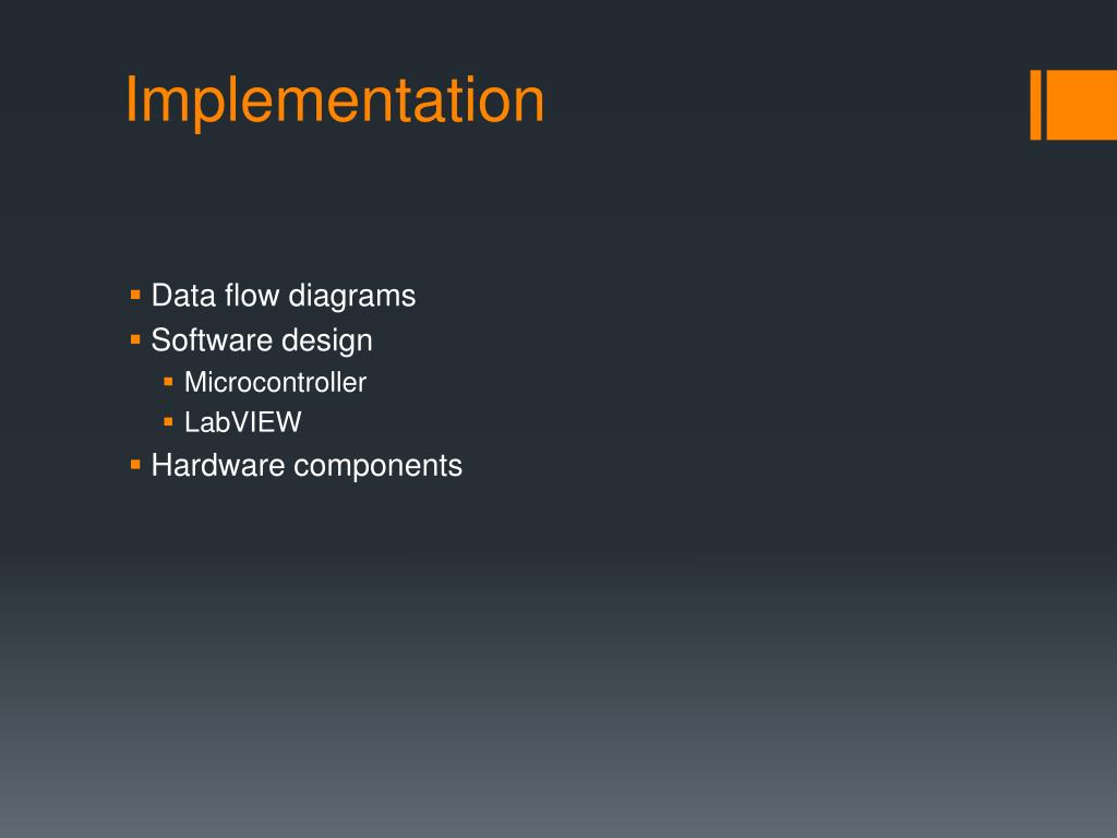 Implementation • Data flow diagrams • Software design • Microcontroller • LabVIEW • Hardware components