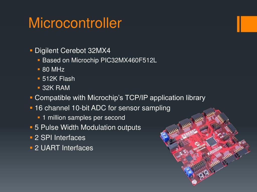 Microcontroller • DigilentCerebot 32MX4 • Based on Microchip PIC32MX460F512L • 80 MHz • 512K Flash • 32K RAM • Compatible with Microchip’s TCP/IP application library • 16 channel 10-bit ADC for sensor sampling • 1 million samples per second • 5 Pulse Width Modulation outputs • 2 SPI Interfaces • 2 UART Interfaces