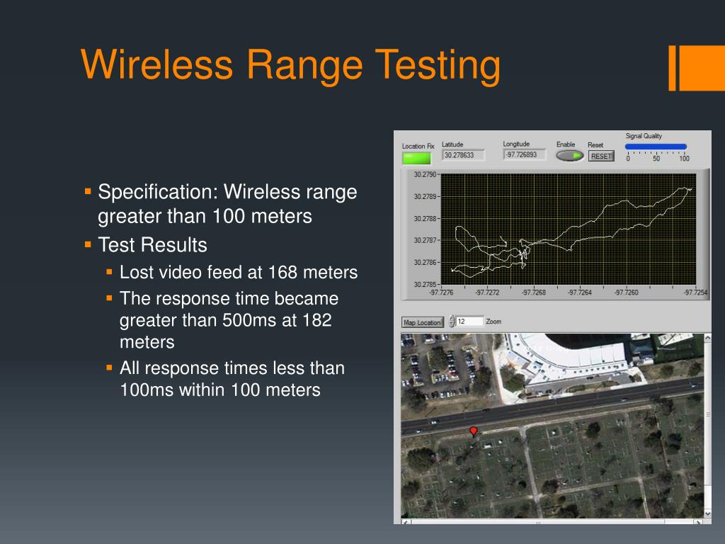 Wireless Range Testing • Specification: Wireless range greater than 100 meters • Test Results • Lost video feed at 168 meters • The response time became greater than 500ms at 182 meters • All response times less than 100ms within 100 meters