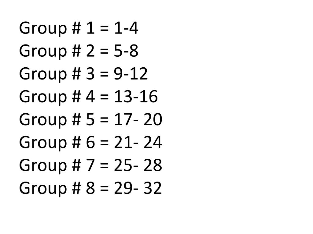Group # 1 = 1-4Group # 2 = 5-8Group # 3 = 9-12Group # 4 = 13-16Group # 5 = 17- 20Group # 6 = 21- 24Group # 7 = 25- 28Group # 8 = 29- 32