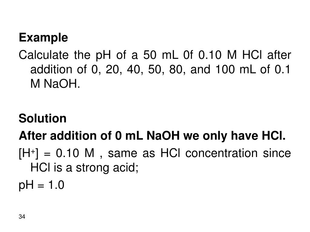 Example Calculate the pH of a 50 mL 0f 0.10 M HCl after addition of 0, 20, 40, 50, 80, and 100 mL of 0.1 M NaOH. Solution After addition of 0 mL NaOH we only have HCl. [H+] = 0.10 M , same as HCl concentration since HCl is a strong acid; pH = 1.0