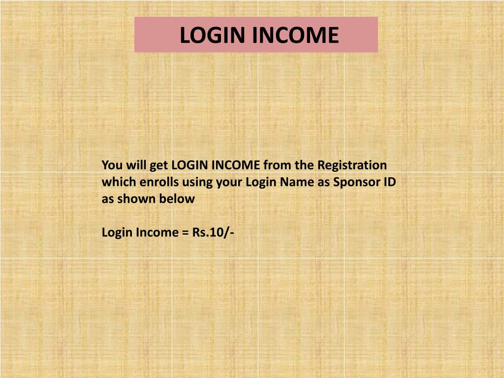LOGIN INCOME You will get LOGIN INCOME from the Registration which enrolls using your Login Name as Sponsor ID as shown below Login Income = Rs.10/-