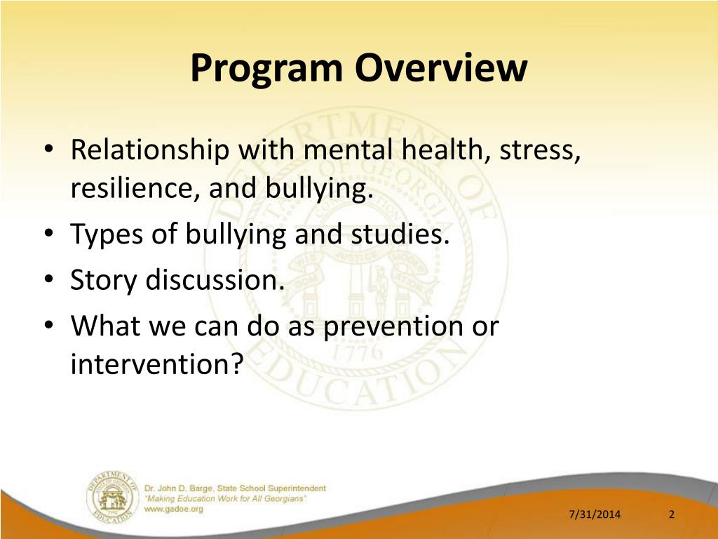 Program Overview • Relationship with mental health, stress, resilience, and bullying. • Types of bullying and studies. • Story discussion. • What we can do as prevention or intervention?