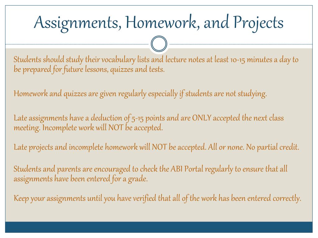 Assignments, Homework, and Projects Students should study their vocabulary lists and lecture notes at least 10-15 minutes a day to be prepared for future lessons, quizzes and tests. Homework and quizzes are given regularly especially if students are not studying. Late assignments have a deduction of 5-15 points and are ONLY accepted the next class meeting. Incomplete work will NOT be accepted. Late projects and incomplete homework will NOT be accepted.All or none. No partial credit. Students and parents are encouraged to check the ABI Portal regularly to ensure that all assignments have been entered for a grade. Keep your assignments until you have verified that all of the work has been entered correctly.