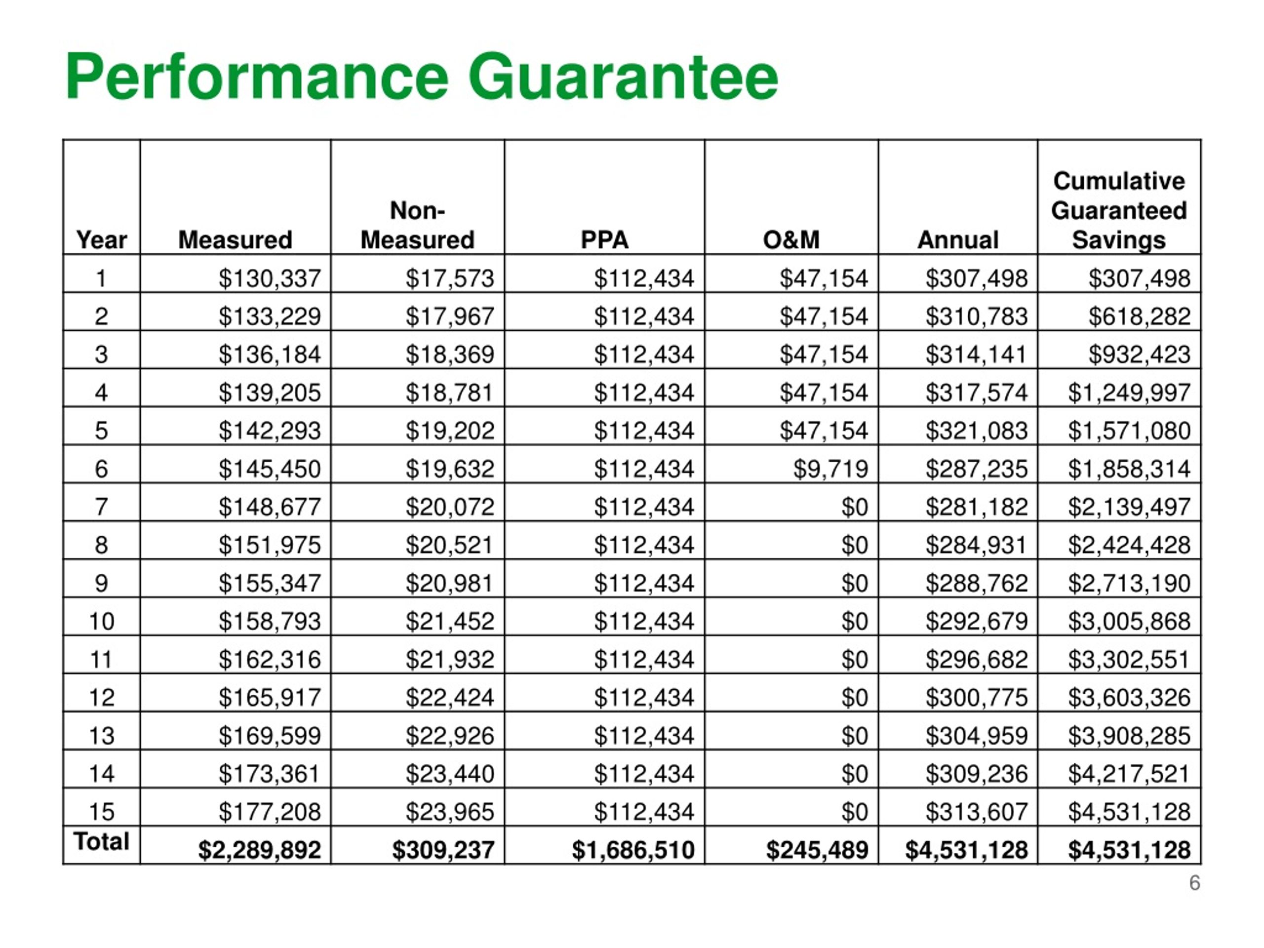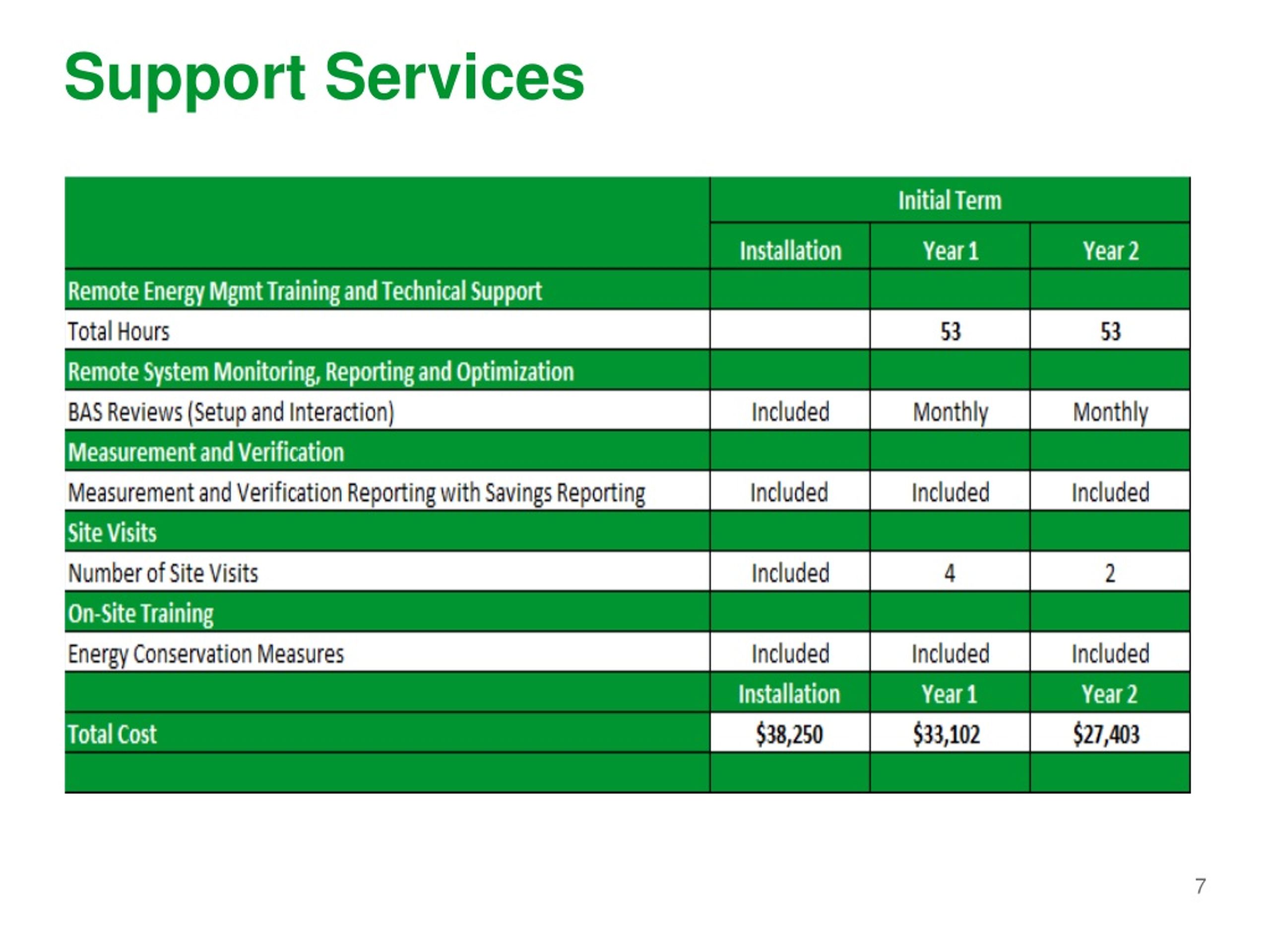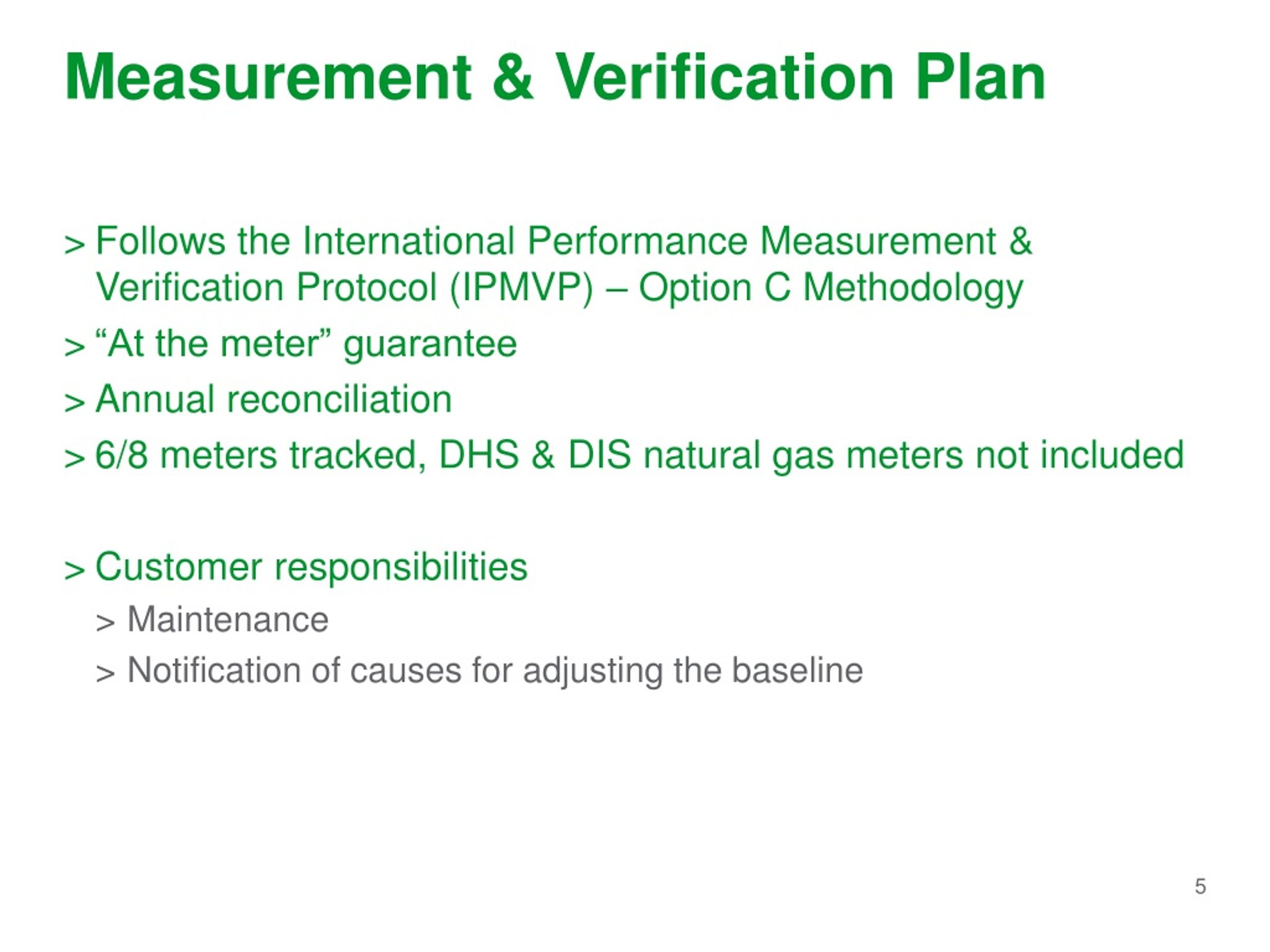 Measurement & Verification Plan • Follows the International Performance Measurement & Verification Protocol (IPMVP) – Option C Methodology • “At the meter” guarantee • Annual reconciliation • 6/8 meters tracked, DHS & DIS natural gas meters not included • Customer responsibilities • Maintenance • Notification of causes for adjusting the baseline