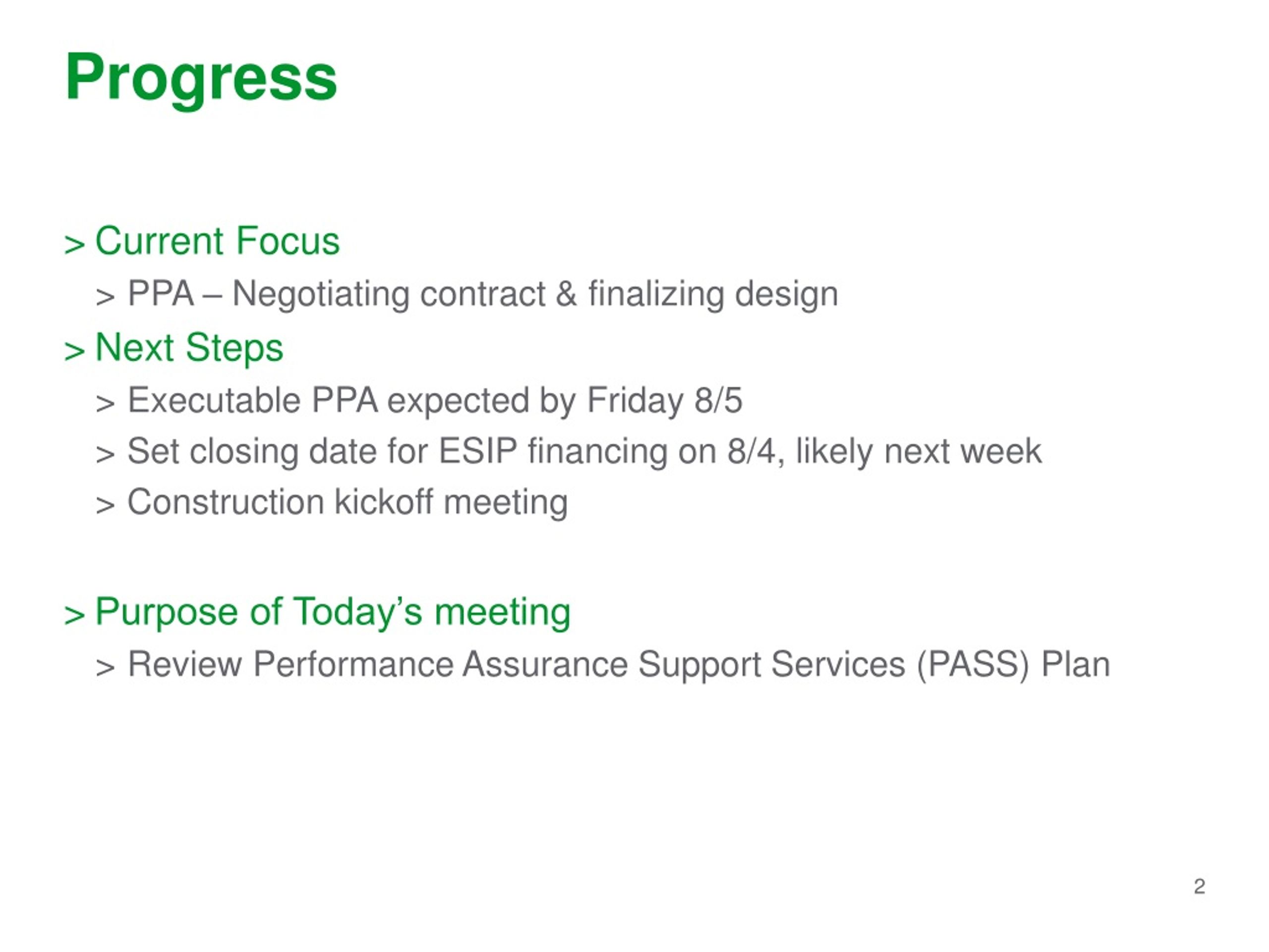 Progress • Current Focus • PPA – Negotiating contract & finalizing design • Next Steps • Executable PPA expected by Friday 8/5 • Set closing date for ESIP financing on 8/4, likely next week • Construction kickoff meeting • Purpose of Today’s meeting • Review Performance Assurance Support Services (PASS) Plan