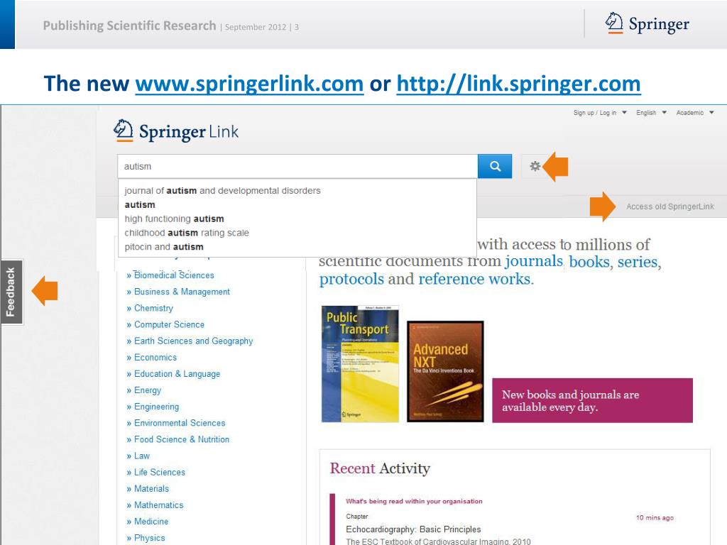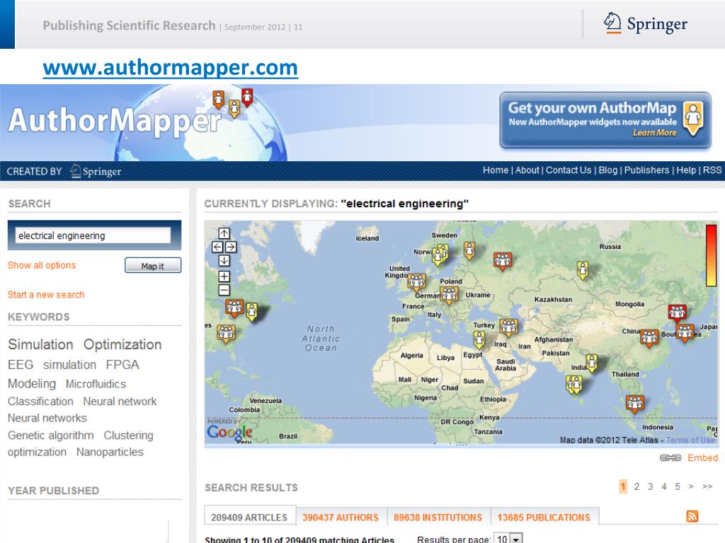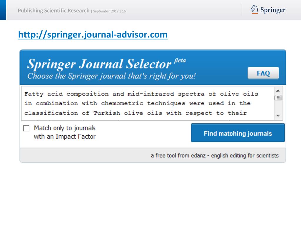Plataformas disponibles para autores • www.springerlink.com / http://link.springer.com - > 5,8 million documents • www.springer.com - Extensive information platform • www.springer.com/authoracademy- Answers questions about writing for scientific publication • www.authormapper.com - See where the research is coming from, who you can collaborate with • www.springerexemplar.com - How is a specific term used in context; in a sentence in any of the work published on SpringerLink? • www.LaTeXSearch.com - Search and copy codes for mathematical equations • http://springer.journal-advisor.com (Beta version!) - Type in the abstract of your article and receive advise on which journals best match your article