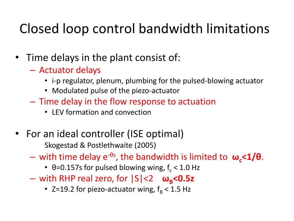 Closed loop control bandwidth limitations • Time delays in the plant consist of: • Actuator delays • i-p regulator, plenum, plumbing for the pulsed-blowing actuator • Modulated pulse of the piezo-actuator • Time delay in the flow response to actuation • LEV formation and convection • For an ideal controller (ISE optimal) Skogestad& Postlethwaite (2005) • with time delay e-θs, the bandwidth is limited to ωc<1/θ. • θ=0.157s for pulsed blowing wing, fc < 1.0 Hz • with RHP real zero, for |S|<2 ωB<0.5z • Z=19.2 for piezo-actuator wing, fB< 1.5 Hz