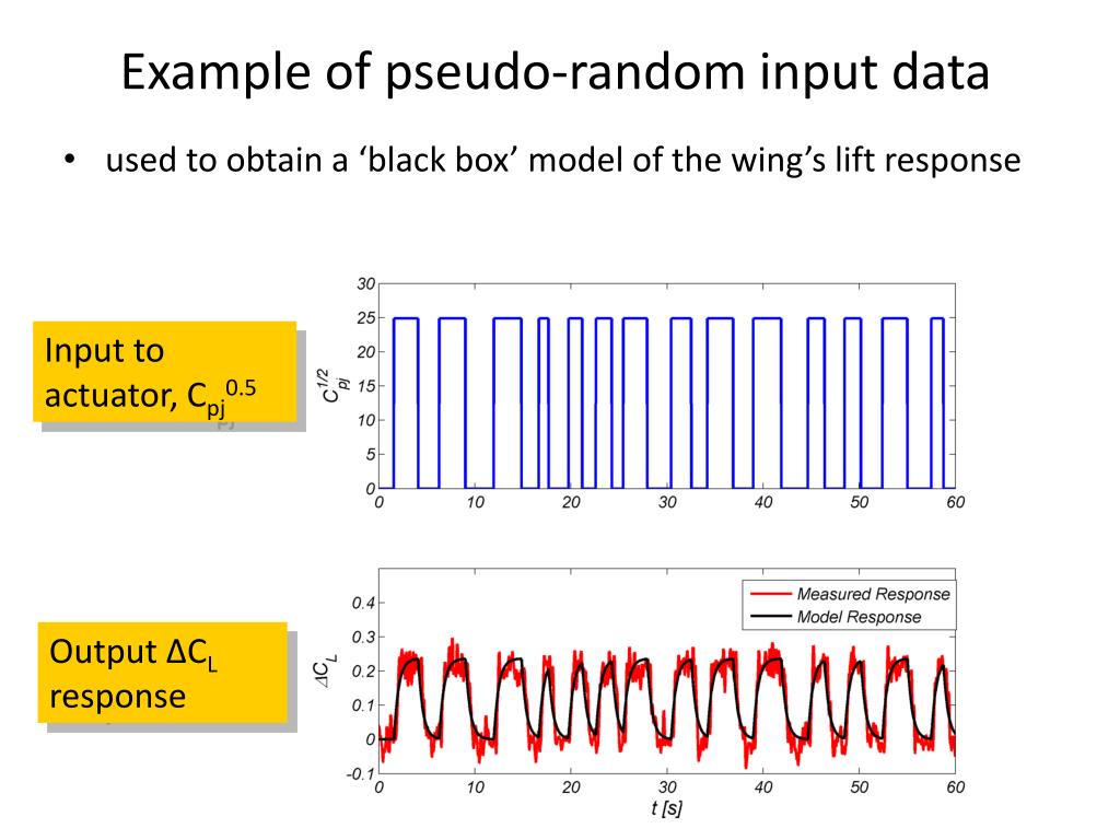 Example of pseudo-random input data • used to obtain a ‘black box’ model of the wing’s lift response Input to actuator, Cpj0.5 Output ΔCL response