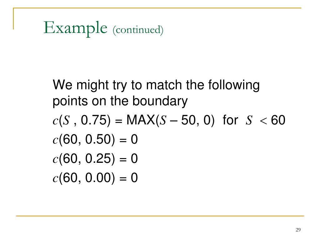 Example (continued) We might try to match the following points on the boundary c(S , 0.75) = MAX(S – 50, 0) for S< 60 c(60, 0.50) = 0 c(60, 0.25) = 0 c(60, 0.00) = 0