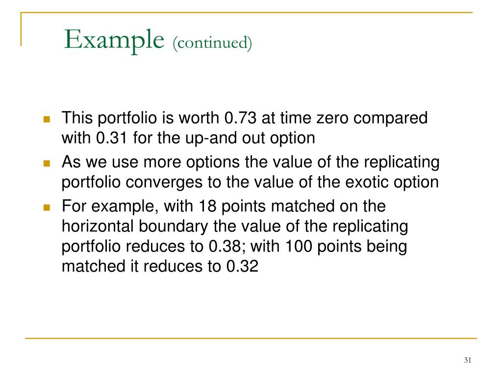 Example (continued) • This portfolio is worth 0.73 at time zero compared with 0.31 for the up-and out option • As we use more options the value of the replicating portfolio converges to the value of the exotic option • For example, with 18 points matched on the horizontal boundary the value of the replicating portfolio reduces to 0.38; with 100 points being matched it reduces to 0.32