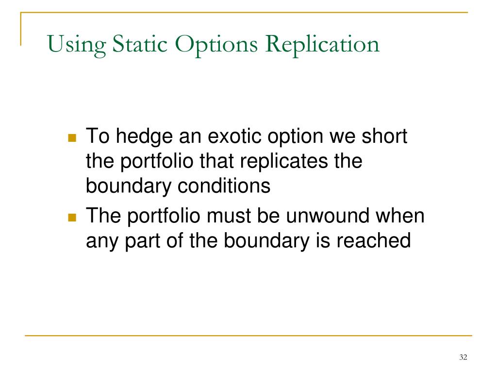Using Static Options Replication • To hedge an exotic option we short the portfolio that replicates the boundary conditions • The portfolio must be unwound when any part of the boundary is reached