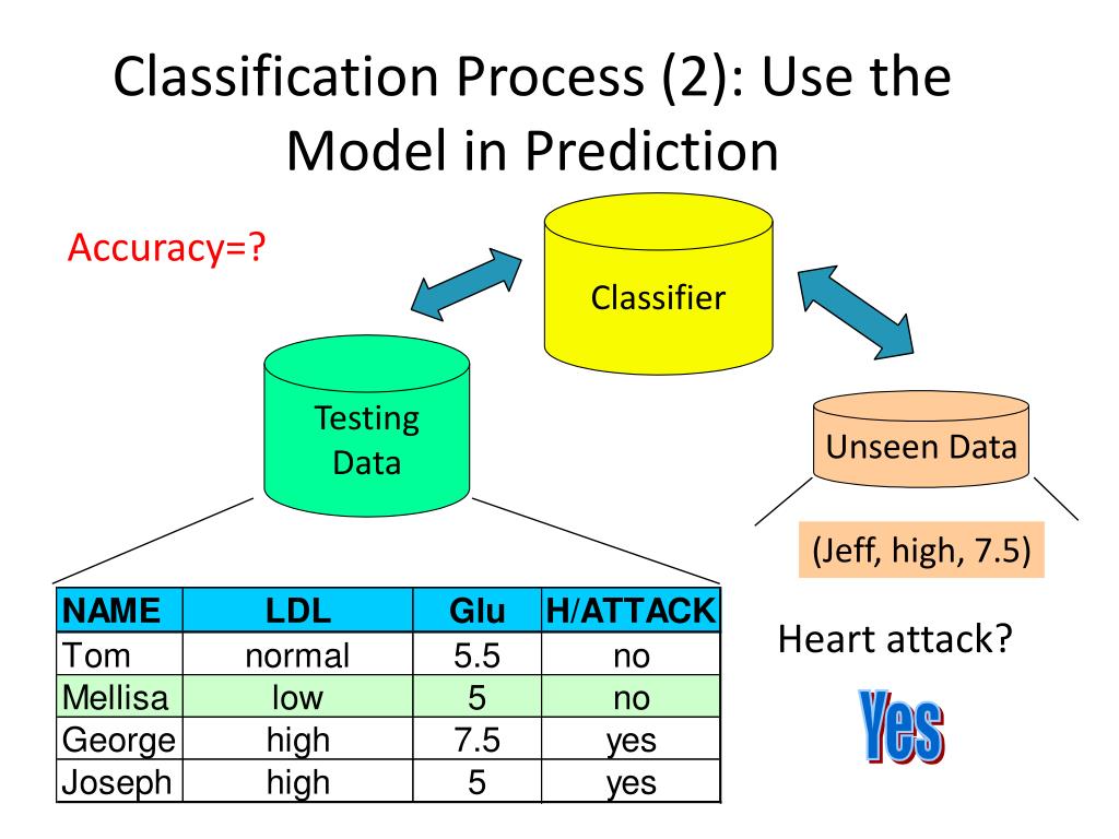 Classifier Testing Data Unseen Data Classification Process (2): Use the Model in Prediction Accuracy=? (Jeff, high, 7.5) Heart attack?