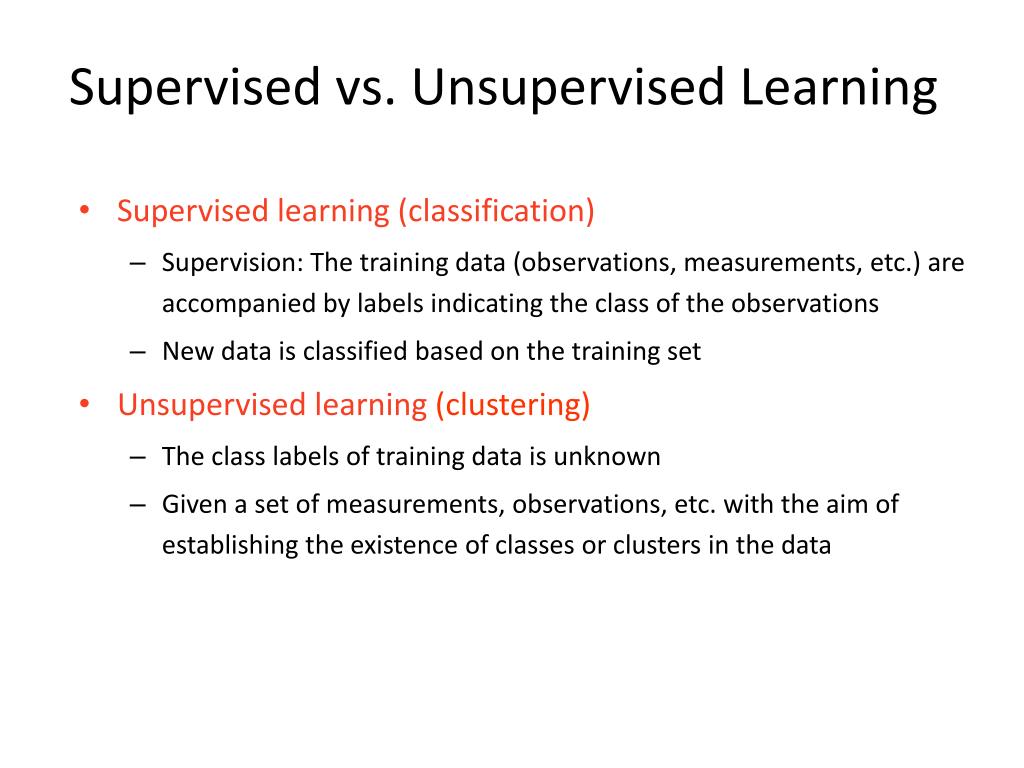 Supervised vs. Unsupervised Learning • Supervised learning (classification) • Supervision: The training data (observations, measurements, etc.) are accompanied by labels indicating the class of the observations • New data is classified based on the training set • Unsupervised learning(clustering) • The class labels of training data is unknown • Given a set of measurements, observations, etc. with the aim of establishing the existence of classes or clusters in the data