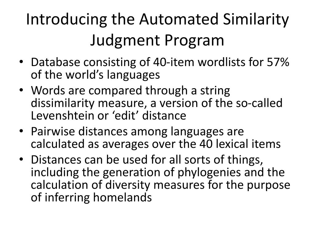 Introducing the Automated Similarity Judgment Program • Database consisting of 40-item wordlists for 57% of the world’s languages • Words are compared through a string dissimilarity measure, a version of the so-called Levenshtein or ‘edit’ distance • Pairwise distances among languages are calculated as averages over the 40 lexical items • Distances can be used for all sorts of things, including the generation of phylogenies and the calculation of diversity measures for the purpose of inferring homelands
