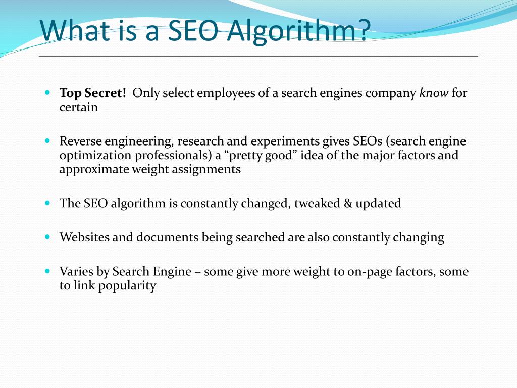 What is a SEO Algorithm? • Top Secret! Only select employees of a search engines company know for certain • Reverse engineering, research and experiments gives SEOs (search engine optimization professionals) a “pretty good” idea of the major factors and approximate weight assignments • The SEO algorithm is constantly changed, tweaked & updated • Websites and documents being searched are also constantly changing • Varies by Search Engine – some give more weight to on-page factors, some to link popularity