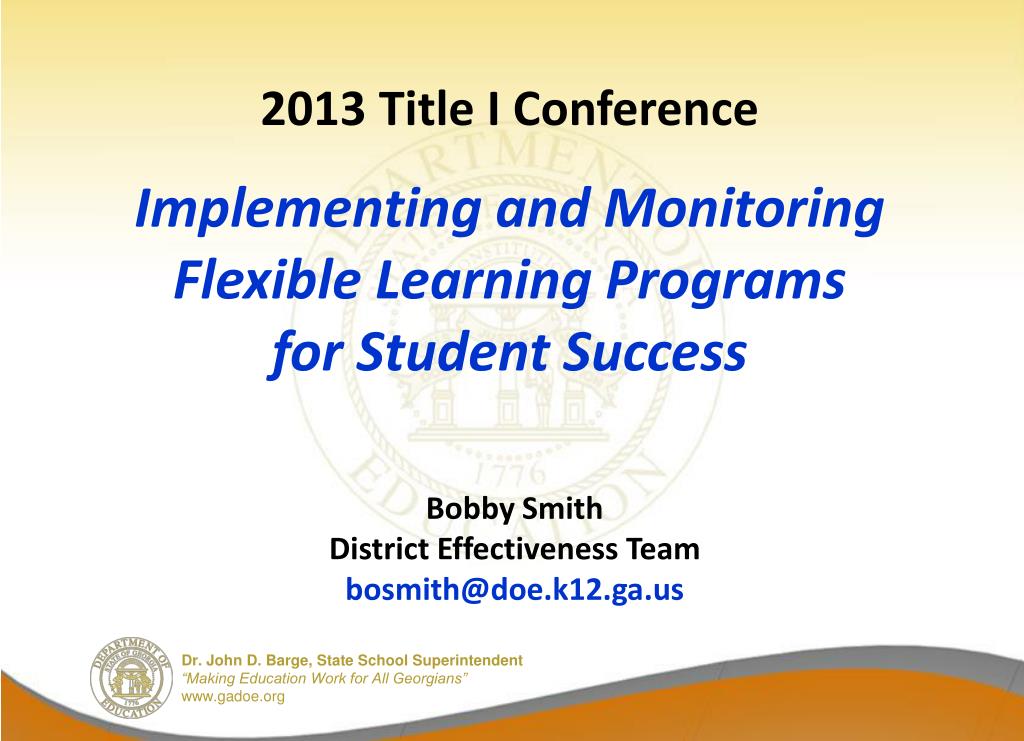 2013 Title I ConferenceImplementing and Monitoring Flexible Learning Programs for Student Success Bobby Smith District Effectiveness Team bosmith@doe.k12.ga.us