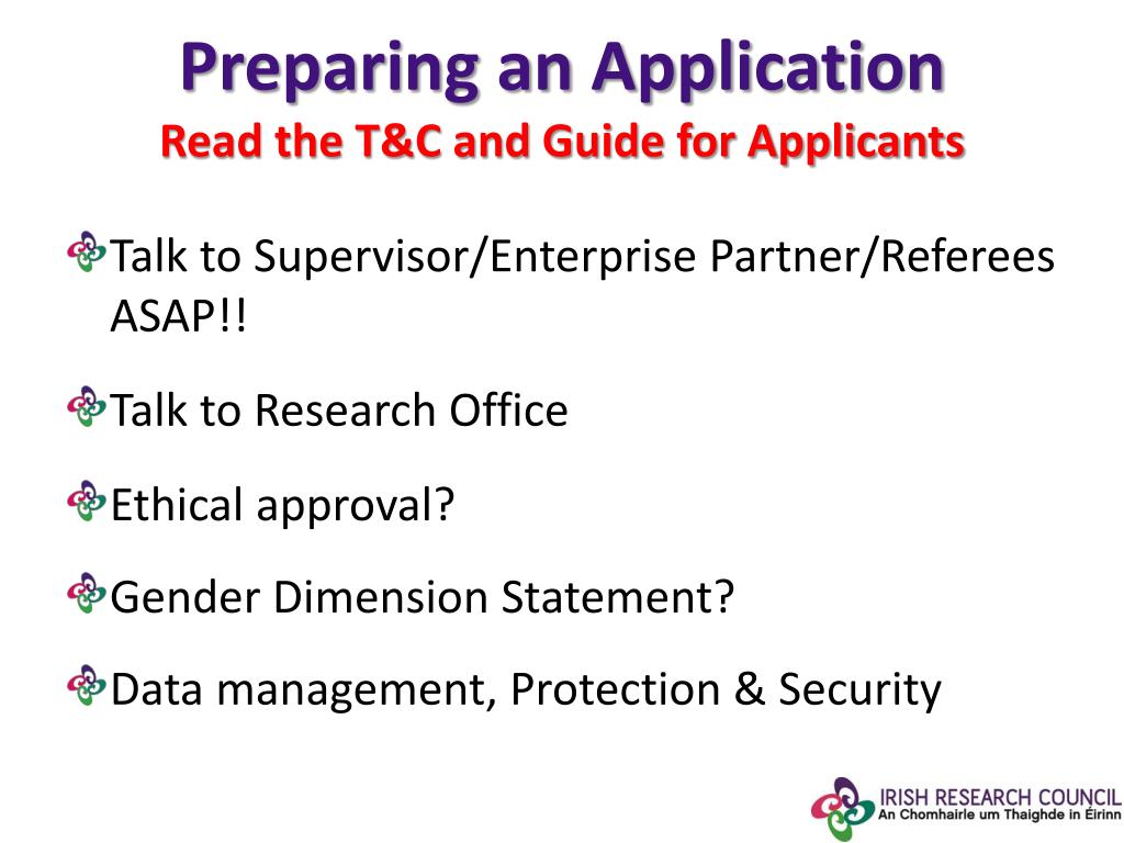 Preparing an Application Read the T&C and Guide for Applicants • Talk to Supervisor/Enterprise Partner/Referees ASAP!! • Talk to Research Office • Ethical approval? • Gender Dimension Statement? • Data management, Protection & Security