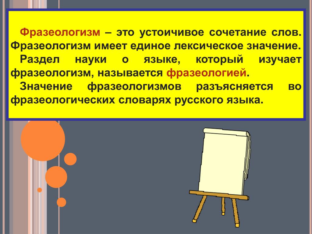 Фразеологизм – это устоичивое сочетание слов. Фразеологизм имеет единое лексическое значение. Раздел науки о языке, который изучает фразеологизм, называется фразеологией. Значение фразеологизмов разъясняется во фразеологических словарях русского языка.
