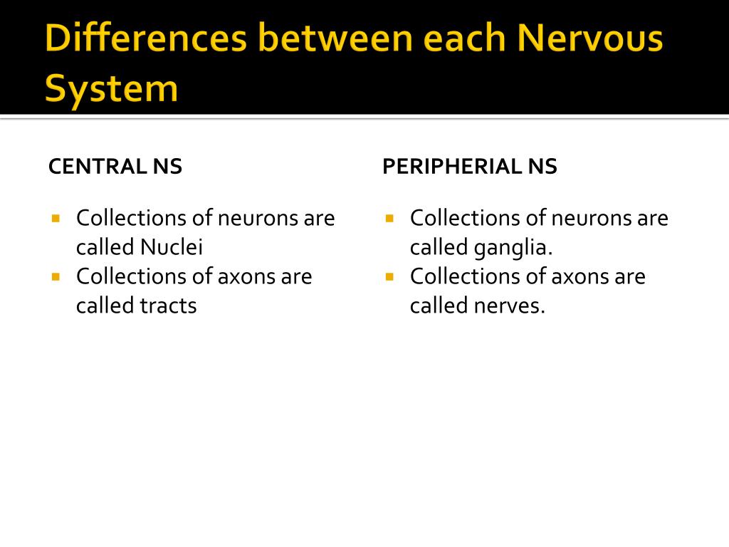 Differences between each Nervous System Central NS PERIPHERIAL NS Collections of neurons are called ganglia. Collections of axons are called nerves. • Collections of neurons are called Nuclei • Collections of axons are called tracts