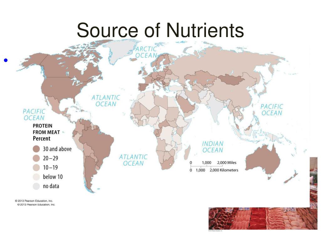 Source of Nutrients • Protein is needed for growth and maintenance of the human body—where a country gets the majority of its protein tells a lot about the people there • The primary difference between LDC and MDC is the source of protein in their diets