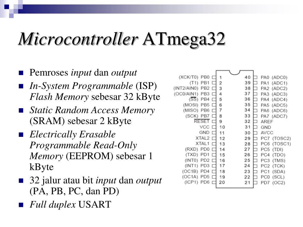 Microcontroller ATmega32 • Pemroses input dan output • In-System Programmable (ISP) Flash Memory sebesar 32 kByte • Static Random Access Memory (SRAM) sebesar 2kByte • Electrically Erasable Programmable Read-Only Memory (EEPROM) sebesar 1 kByte • 32 jalur atau bit input dan output (PA, PB, PC, dan PD) • Full duplexUSART