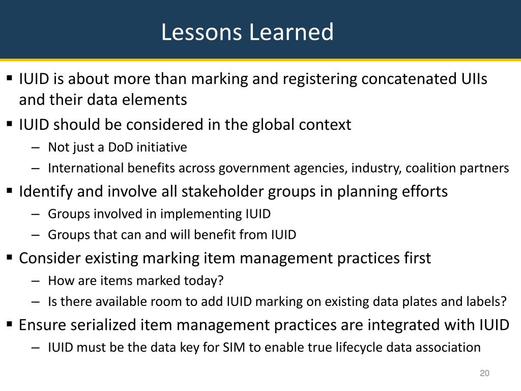 Lessons Learned • IUID is about more than marking and registering concatenated UIIs and their data elements • IUID should be considered in the global context • Not just a DoD initiative • International benefits across government agencies, industry, coalition partners • Identify and involve all stakeholder groups in planning efforts • Groups involved in implementing IUID • Groups that can and will benefit from IUID • Consider existing marking item management practices first • How are items marked today? • Is there available room to add IUID marking on existing data plates and labels? • Ensure serialized item management practices are integrated with IUID • IUID must be the data key for SIM to enable true lifecycle data association
