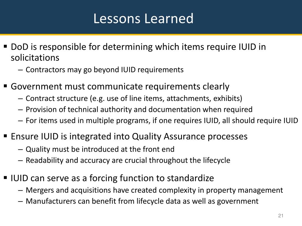 Lessons Learned • DoD is responsible for determining which items require IUID in solicitations • Contractors may go beyond IUID requirements • Government must communicate requirements clearly • Contract structure (e.g. use of line items, attachments, exhibits) • Provision of technical authority and documentation when required • For items used in multiple programs, if one requires IUID, all should require IUID • Ensure IUID is integrated into Quality Assurance processes • Quality must be introduced at the front end • Readability and accuracy are crucial throughout the lifecycle • IUID can serve as a forcing function to standardize • Mergers and acquisitions have created complexity in property management • Manufacturers can benefit from lifecycle data as well as government