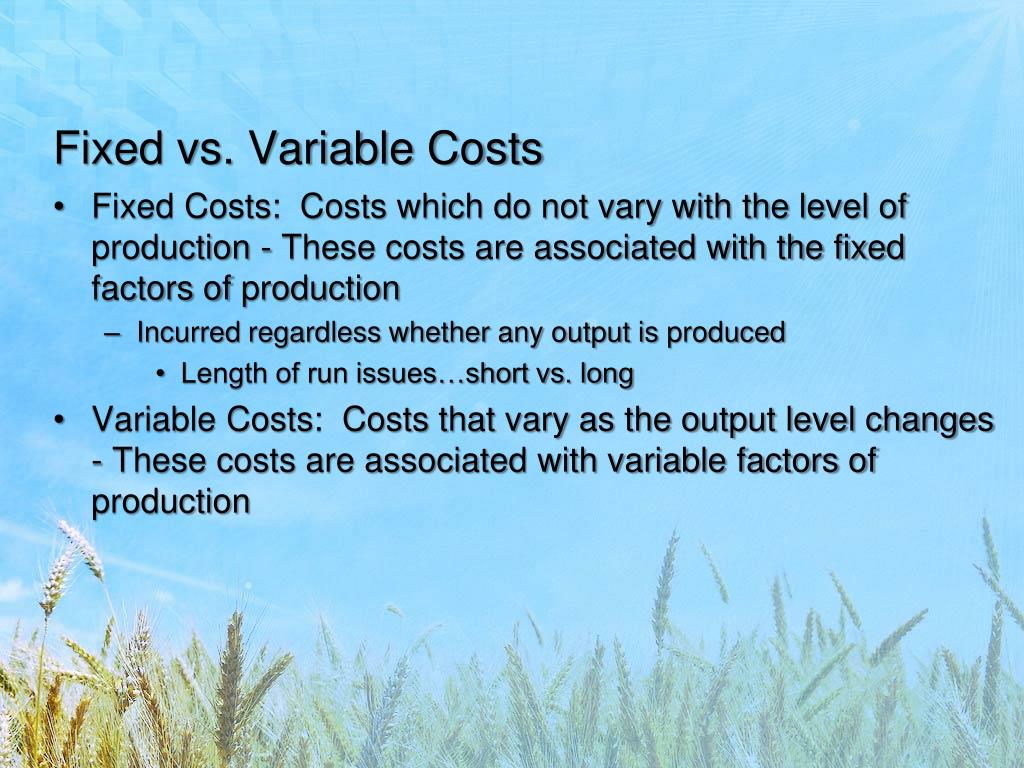 Fixed vs. Variable Costs • Fixed Costs: Costs which do not vary with the level of production - These costs are associated with the fixed factors of production • Incurred regardless whether any output is produced • Length of run issues…short vs. long • Variable Costs: Costs that vary as the output level changes - These costs are associated with variable factors of production