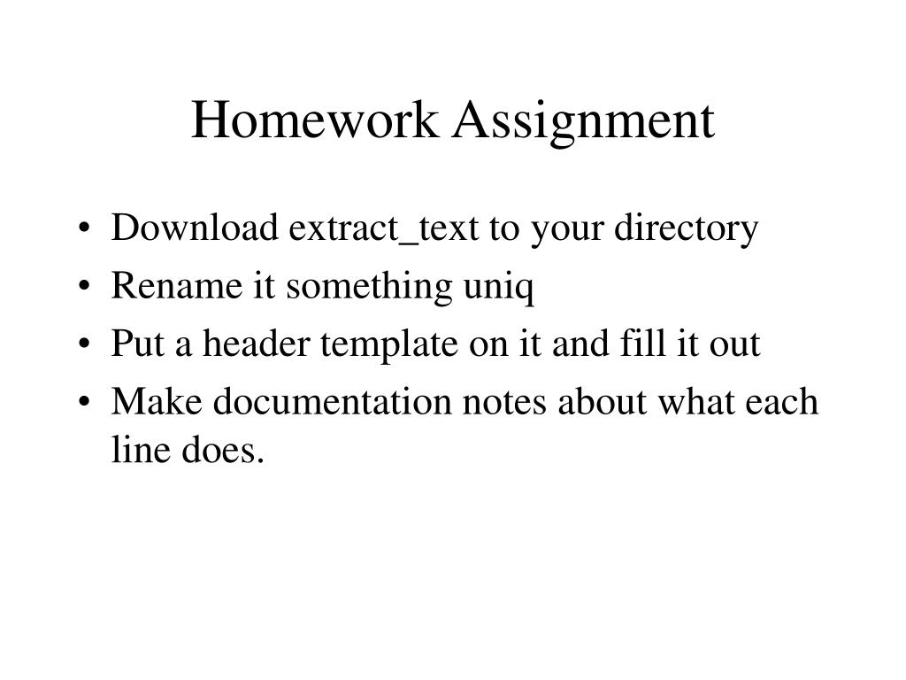 Homework Assignment • Download extract_text to your directory • Rename it something uniq • Put a header template on it and fill it out • Make documentation notes about what each line does.