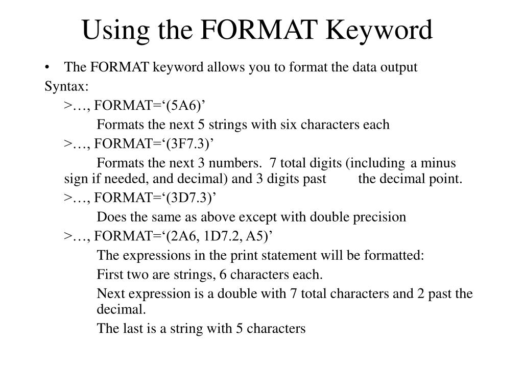 Using the FORMAT Keyword • The FORMAT keyword allows you to format the data output Syntax: >…, FORMAT=‘(5A6)’ Formats the next 5 strings with six characters each >…, FORMAT=‘(3F7.3)’ Formats the next 3 numbers. 7 total digits (including a minus sign if needed, and decimal) and 3 digits past the decimal point. >…, FORMAT=‘(3D7.3)’ Does the same as above except with double precision >…, FORMAT=‘(2A6, 1D7.2, A5)’ The expressions in the print statement will be formatted: First two are strings, 6 characters each. Next expression is a double with 7 total characters and 2 past the decimal. The last is a string with 5 characters