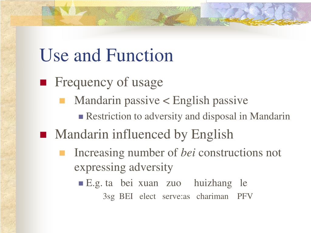 Use and Function • Frequency of usage • Mandarin passive < English passive • Restriction to adversity and disposal in Mandarin • Mandarin influenced by English • Increasing number of bei constructions not expressing adversity • E.g. ta bei xuan zuo huizhang le 3sg BEI elect serve:as chariman PFV