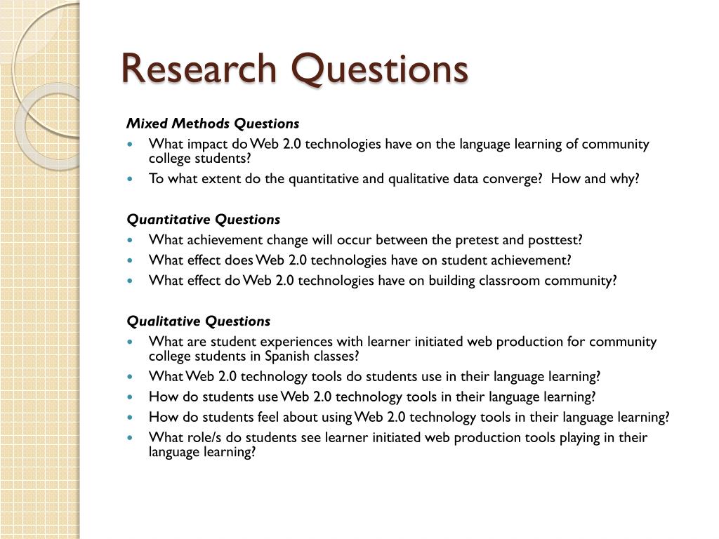 Research Questions Mixed Methods Questions • What impact do Web 2.0 technologies have on the language learning of community college students? • To what extent do the quantitative and qualitative data converge? How and why? Quantitative Questions • What achievement change will occur between the pretest and posttest? • What effect does Web 2.0 technologies have on student achievement? • What effect do Web 2.0 technologies have on building classroom community? Qualitative Questions • What are student experiences with learner initiated web production for community college students in Spanish classes? • What Web 2.0 technology tools do students use in their language learning? • How do students use Web 2.0 technology tools in their language learning? • How do students feel about using Web 2.0 technology tools in their language learning? • What role/s do students see learner initiated web production tools playing in their language learning?