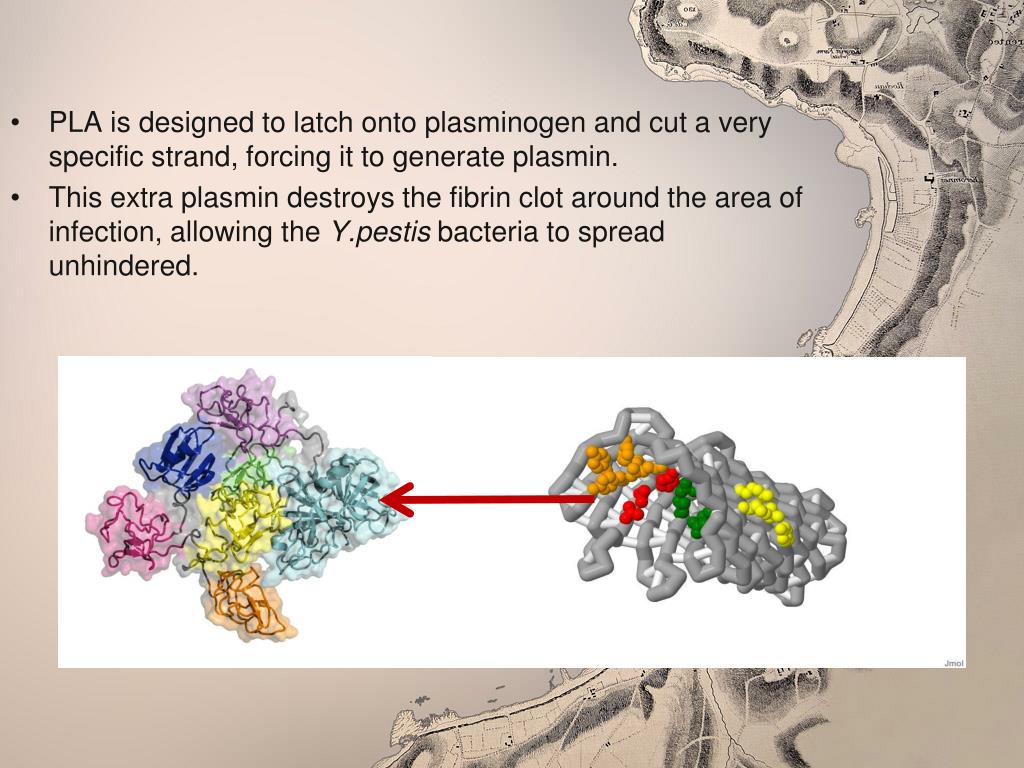 PLA is designed to latch onto plasminogen and cut a very specific strand, forcing it to generate plasmin. • This extra plasmin destroys the fibrin clot around the area of infection, allowing the Y.pestis bacteria to spread unhindered.