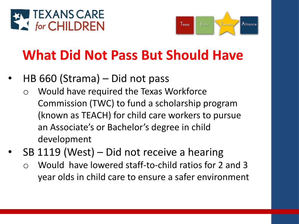 What Did Not Pass But Should Have • HB 660 (Strama) – Did not pass • Would have required the Texas Workforce Commission (TWC) to fund a scholarship program (known as TEACH) for child care workers to pursue an Associate’s or Bachelor’s degree in child development • SB 1119 (West) – Did not receive a hearing • Would have lowered staff-to-child ratios for 2 and 3 year olds in child care to ensure a safer environment