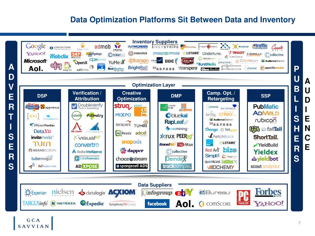 DSP Verification / Attribution Camp. Opt. / Retargeting SSP DMP Data Optimization Platforms Sit Between Data and Inventory Inventory Suppliers ADVERTISERS PUBLISHERS AUDIENCE Optimization Layer Creative Optimization Data Suppliers