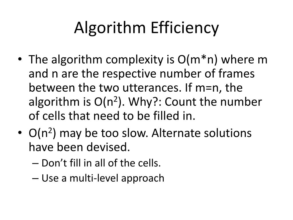Algorithm Efficiency • The algorithm complexity is O(m*n) where m and n are the respective number of frames between the two utterances. If m=n, the algorithm is O(n2). Why?: Count the number of cells that need to be filled in. • O(n2) may be too slow. Alternate solutions have been devised. • Don’t fill in all of the cells. • Use a multi-level approach