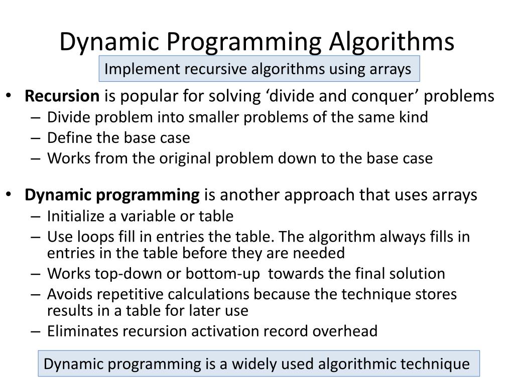 Dynamic Programming Algorithms Implement recursive algorithms using arrays • Recursion is popular for solving ‘divide and conquer’ problems • Divide problem into smaller problems of the same kind • Define the base case • Works from the original problem down to the base case • Dynamic programming is another approach that uses arrays • Initialize a variable or table • Use loops fill in entries the table. The algorithm always fills in entries in the table before they are needed • Works top-down or bottom-up towards the final solution • Avoids repetitive calculations because the technique stores results in a table for later use • Eliminates recursion activation record overhead Dynamic programming is a widely used algorithmic technique