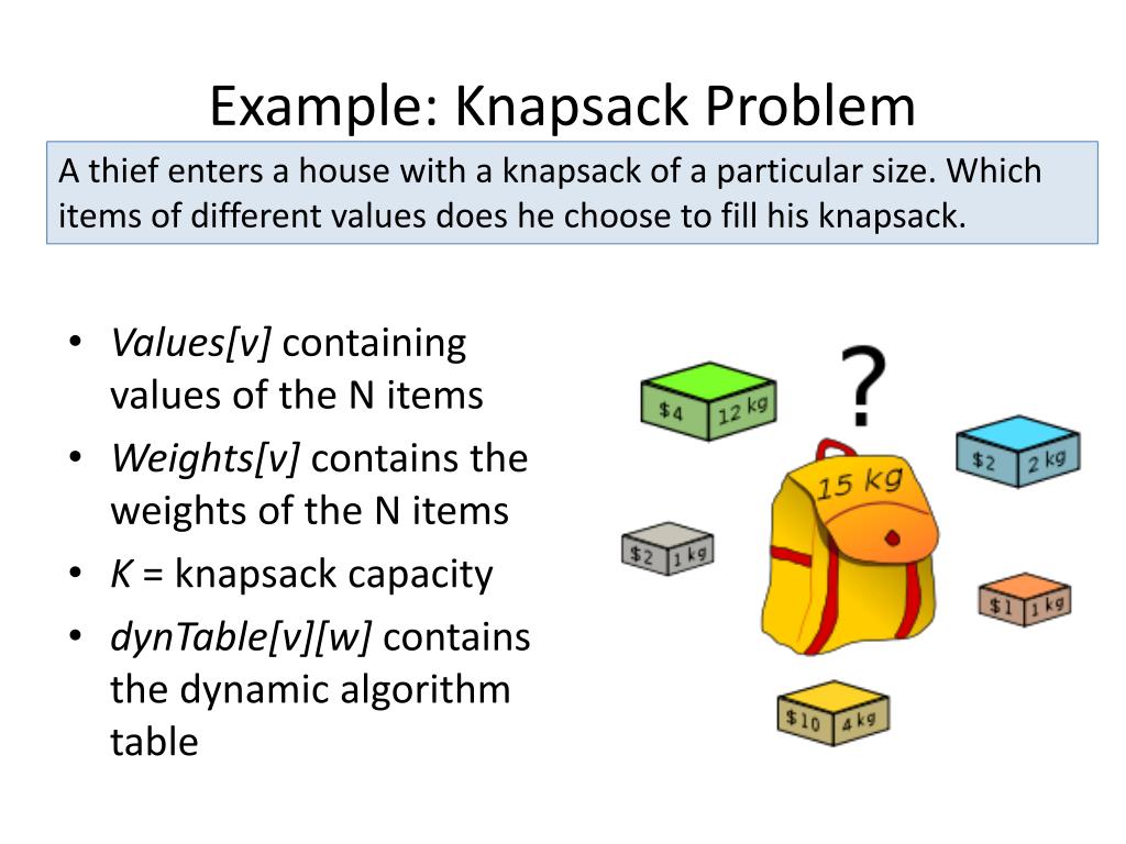 Example: Knapsack Problem A thief enters a house with a knapsack of a particular size. Which items of different values does he choose to fill his knapsack. • Values[v] containing values of the N items • Weights[v] contains the weights of the N items • K = knapsack capacity • dynTable[v][w] contains the dynamic algorithm table