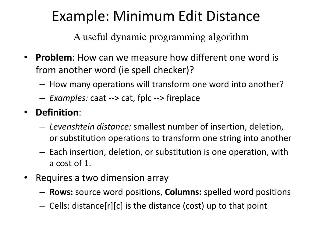 Example: Minimum Edit Distance A useful dynamic programming algorithm • Problem: How can we measure how different one word is from another word (ie spell checker)? • How many operations will transform one word into another? • Examples: caat --> cat, fplc --> fireplace • Definition: • Levenshtein distance: smallest number of insertion, deletion, or substitution operations to transform one string into another • Each insertion, deletion, or substitution is one operation, with a cost of 1. • Requires a two dimension array • Rows: source word positions, Columns: spelled word positions • Cells: distance[r][c] is the distance (cost) up to that point