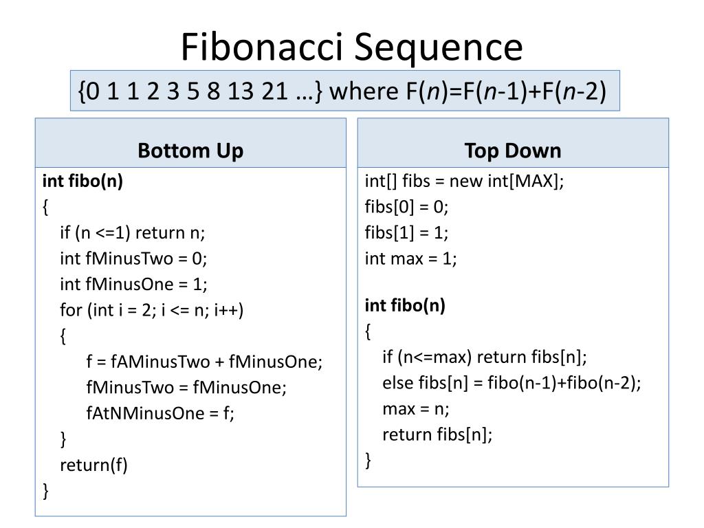 Fibonacci Sequence {0 1 1 2 3 5 8 13 21 …} where F(n)=F(n-1)+F(n-2) Bottom Up Top Down int[] fibs = new int[MAX]; fibs[0] = 0; fibs[1] = 1; int max = 1; intfibo(n) { if (n<=max) return fibs[n]; else fibs[n] = fibo(n-1)+fibo(n-2); max = n; return fibs[n]; } intfibo(n) { if (n <=1) return n; intfMinusTwo = 0; intfMinusOne = 1; for (inti = 2; i <= n; i++) { f = fAMinusTwo + fMinusOne; fMinusTwo= fMinusOne; fAtNMinusOne= f; } return(f) }