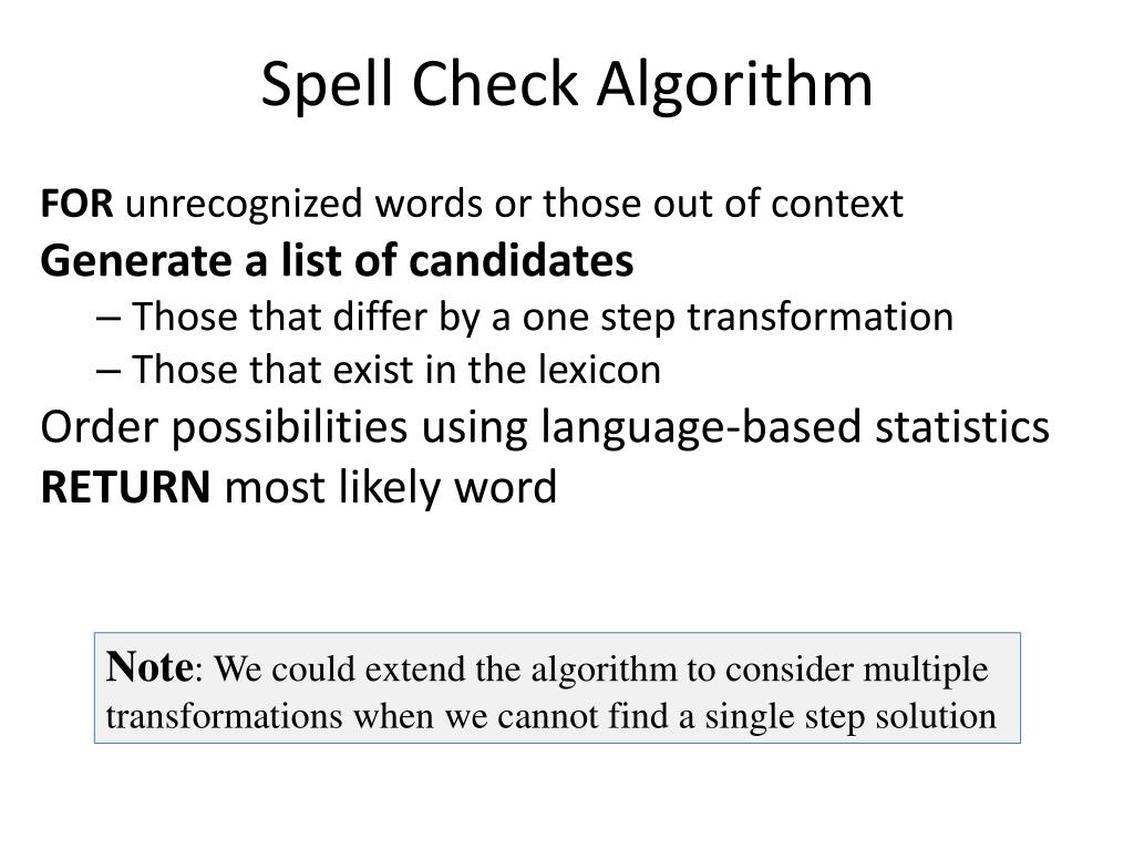 Spell Check Algorithm FOR unrecognized words or those out of context Generate a list of candidates • Those that differ by a one step transformation • Those that exist in the lexicon Order possibilities using language-based statistics RETURN most likely word Note: We could extend the algorithm to consider multiple transformations when we cannot find a single step solution