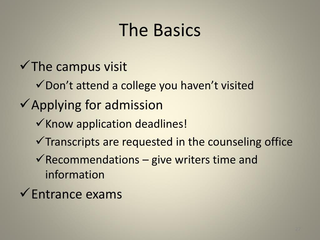 The Basics • The campus visit • Don’t attend a college you haven’t visited • Applying for admission • Know application deadlines! • Transcripts are requested in the counseling office • Recommendations – give writers time and information • Entrance exams