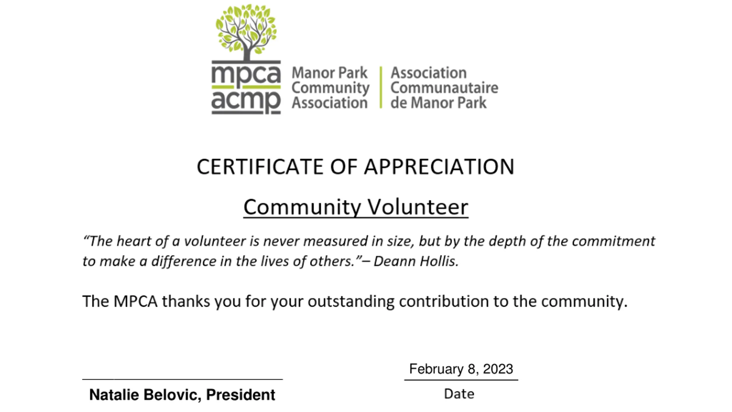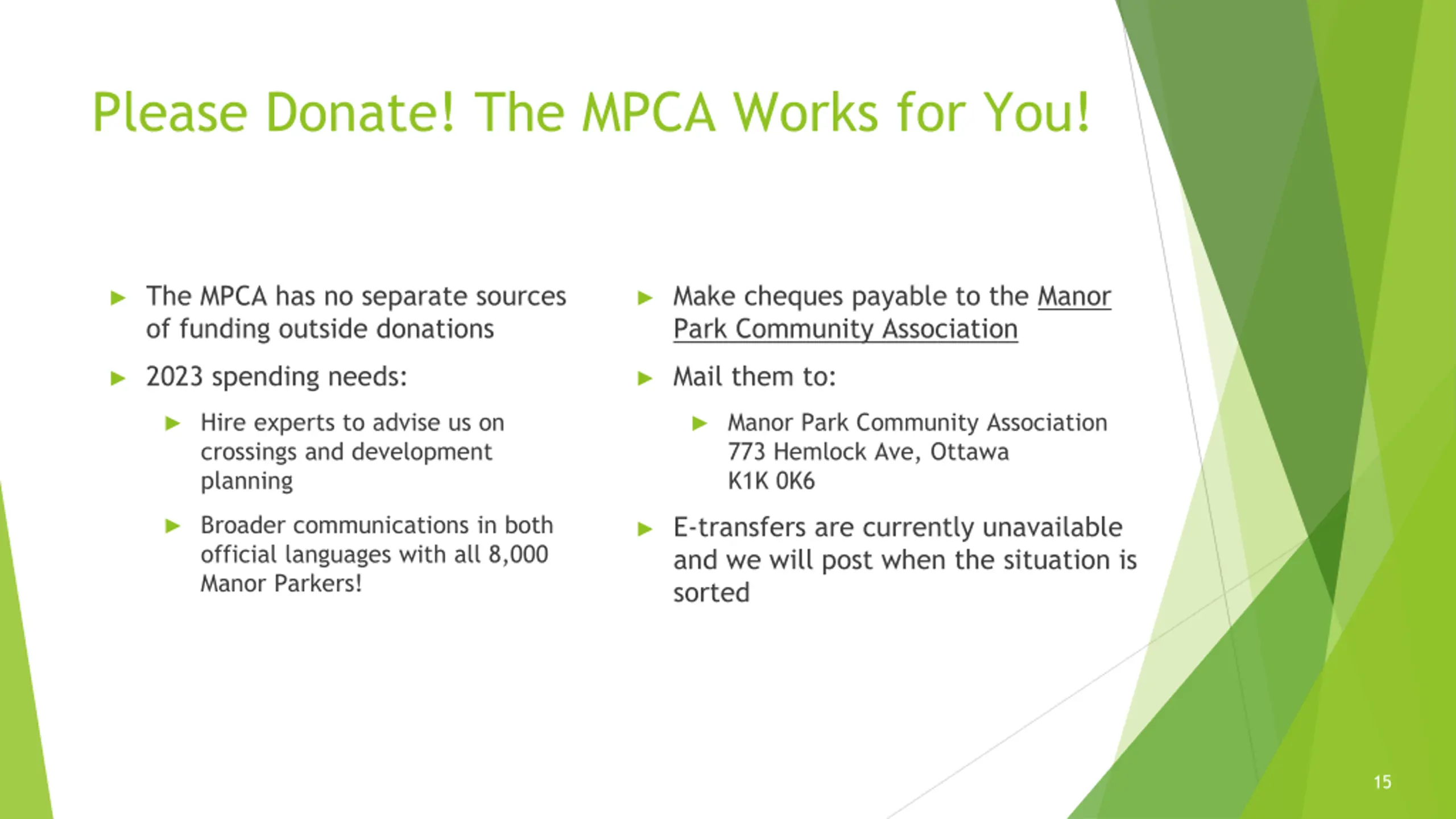 Please Donate! The MPCA Works for You! ► The MPCA has no separate sources of funding outside donations ► Make cheques payable to the Manor Park Community Association ► 2023 spending needs: ► Mail them to: ► Hire experts to advise us on crossings and development planning ► Manor Park Community Association 773 Hemlock Ave, Ottawa K1K 0K6 ► Broader communications in both official languages with all 8,000 Manor Parkers! ► E-transfers are currently unavailable and we will post when the situation is sorted 15